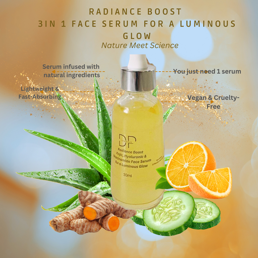 Radiance Boost Serum – A brightening, hydrating dream! Packed with Kojic Acid, Turmeric, and Vitamin C for that even-toned, plump, and radiant glow—all clean, natural, and free of toxins! 🌿